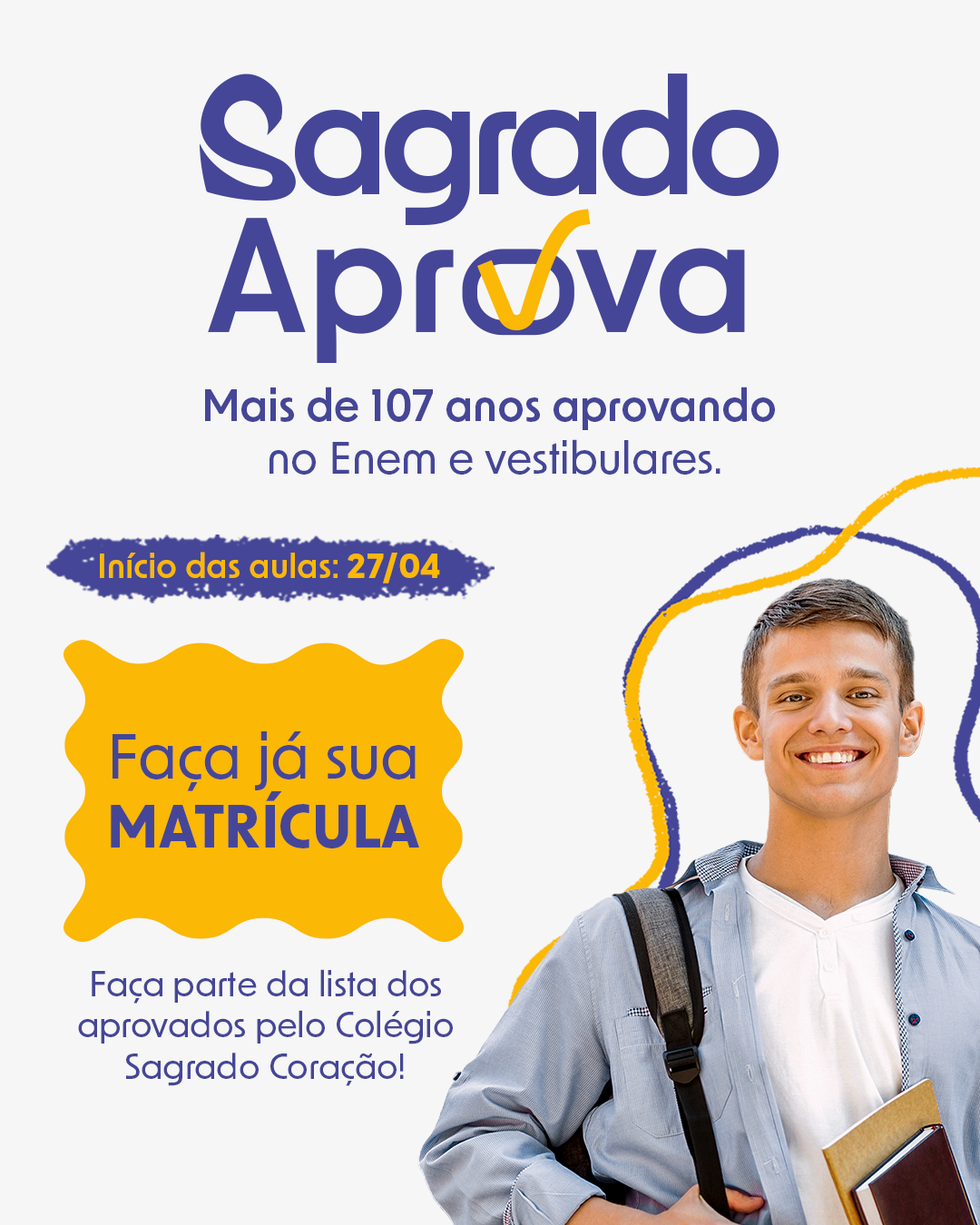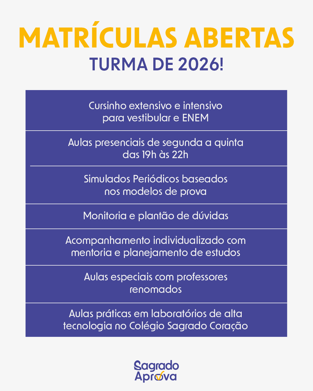 O Sagrado Aprova é um curso extensivo e intensivo de preparação para o vestibular e para o ENEM, oferecido pelo Colégio Sagrado Coração. Com uma metodologia inovadora, tecnológica e totalmente focada na aprovação, o cursinho segue firme no seu propósito: colocar nossos alunos nas melhores universidades do país.